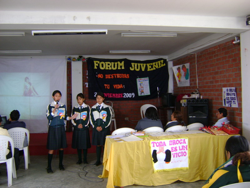 Hoy, 20 de Noviembre, se celebró en la iglesia "Unión Misionera" el 1er Fórum Juvenil "No destruyas tu vida", organizado por el colegio "Virgen de Guadalupe" en el que los alumnos presentarían trabajos de exposición elaborados por ellos mismos abordando el tema del consumo de drogas y las repercusiones que tiene en el ser humano y la sociedad. Dicha institución realizó la convocatoria a otros colegios de la zona para que envíen delegaciones que compartan información, brinden sus puntos de vista sobre el tema y además planteen alternativas de solución frente a este problema que contamina de modo muy cercano y palpable nuestra sociedad.